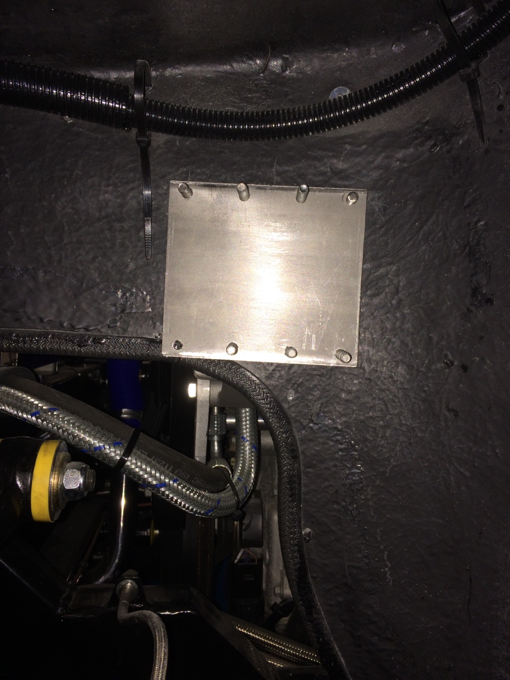 Finally new oil pan on... and introducing the duct scoop... bottom of the bell housing now protrudes below the oil pan. I've made a small aluminium angle shim cover for that and it's all buttoned up.